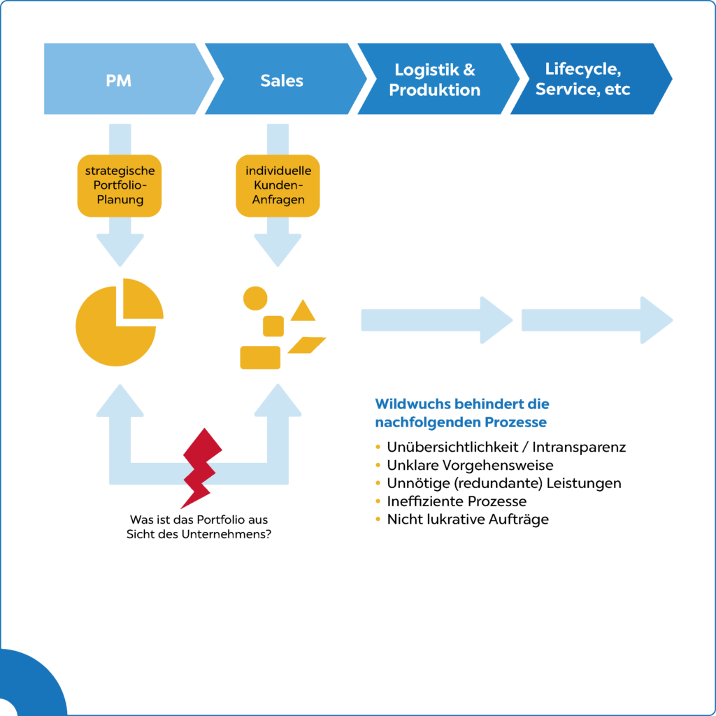 So werden oft alte Produkte nicht abgekündigt. Dadurch wächst das Produktportfolio, wird unübersichtlich und verwässert. Eine solide Portfolioplanung wird auch erschwert, wenn neue Aspekte spontan in bestehende Produktfamilien integriert werden. Das passiert oft in Form eines Projekts und in diesen Momenten steht die Lösung eines individuellen Wunschs im Fokus. Das passiert im Vertrieb und im Produktmanagement auf Basis eines Kundenwunsches oder spontaner Entscheidungen. Ohne ein klares Verständnis des Produkts und seines Variantenraums entsteht also Wildwuchs.